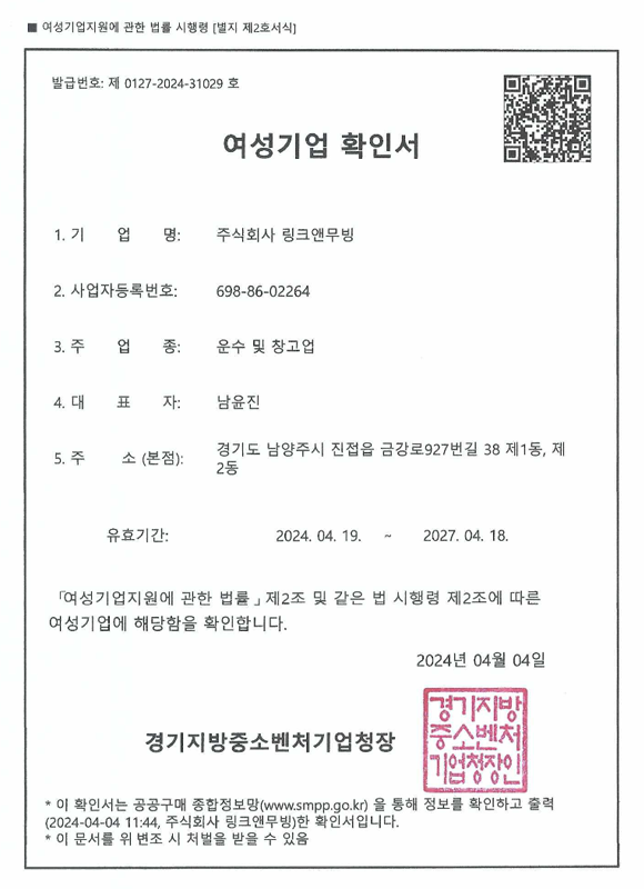 또한 여성기업으로 공공기관 수의계약 한도 증가로 입찰과정 없이 신속한 이사가 가능합니다.